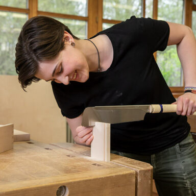 Schreinerinnen und Schreiner posieren mit beeindruckenden Gesellenstücken