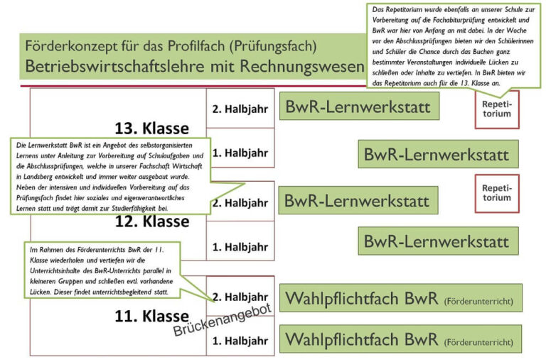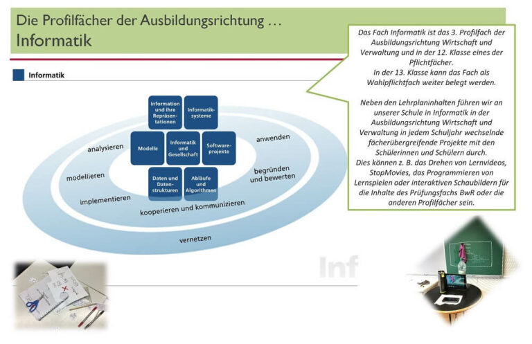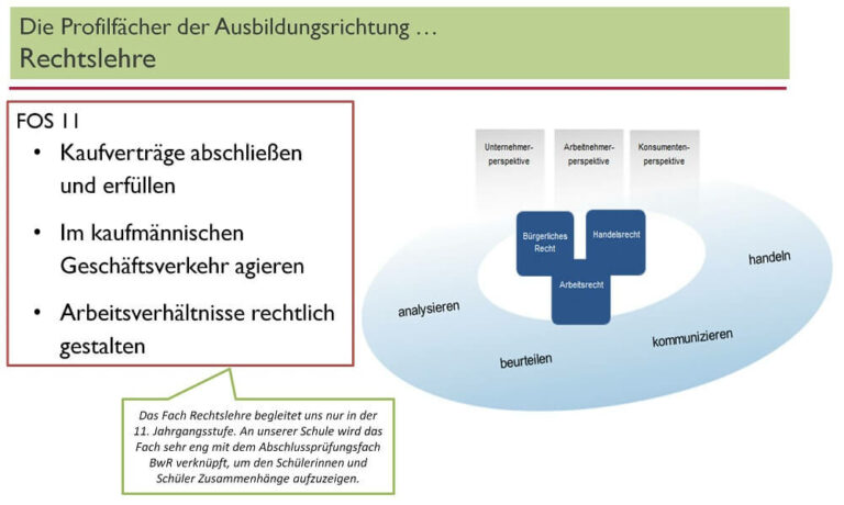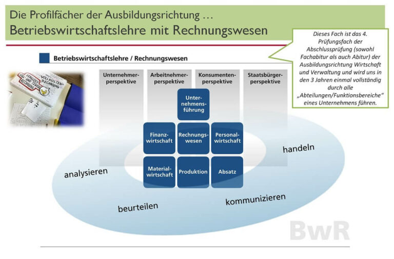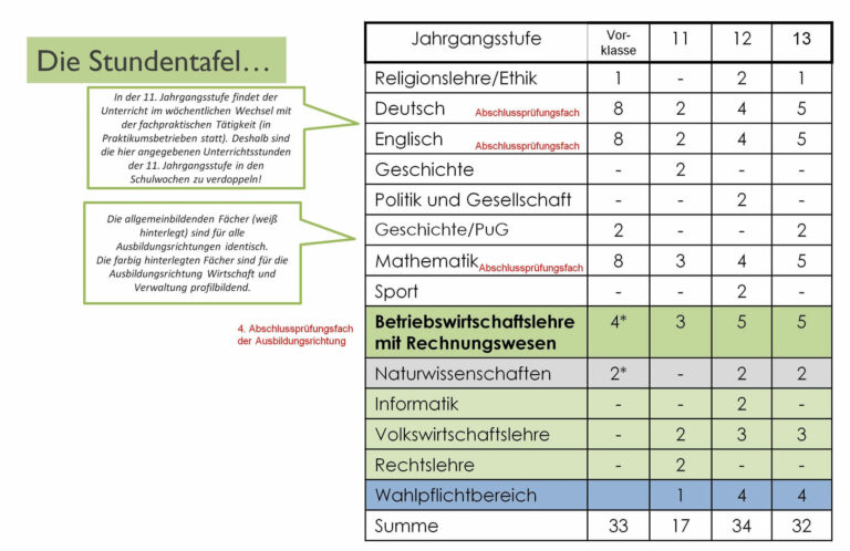 Neben den allgemeinbildenden Fächern liegt der Unterrichtsschwerpunkt in Betriebswirtschaftslehre mit Rechnungswesen. Zur Profilbildung gehören auch die Fächer Informatik, Rechtslehre, Volkwirtschaftslehre und Naturwissenschaften sowie einige Wahlpflichtfächer wie z.B. “Wirtschaft Aktuell‘ und – in englischer Sprache – “International Business Studies”.